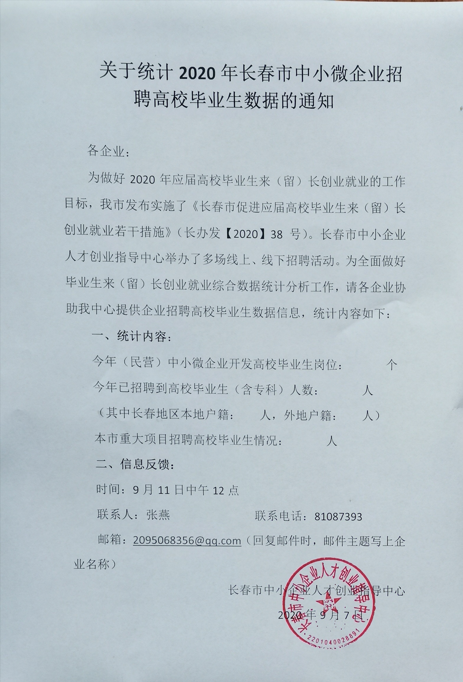 关于统计2020年长春市中小微企业招聘高校毕业生数据的通知