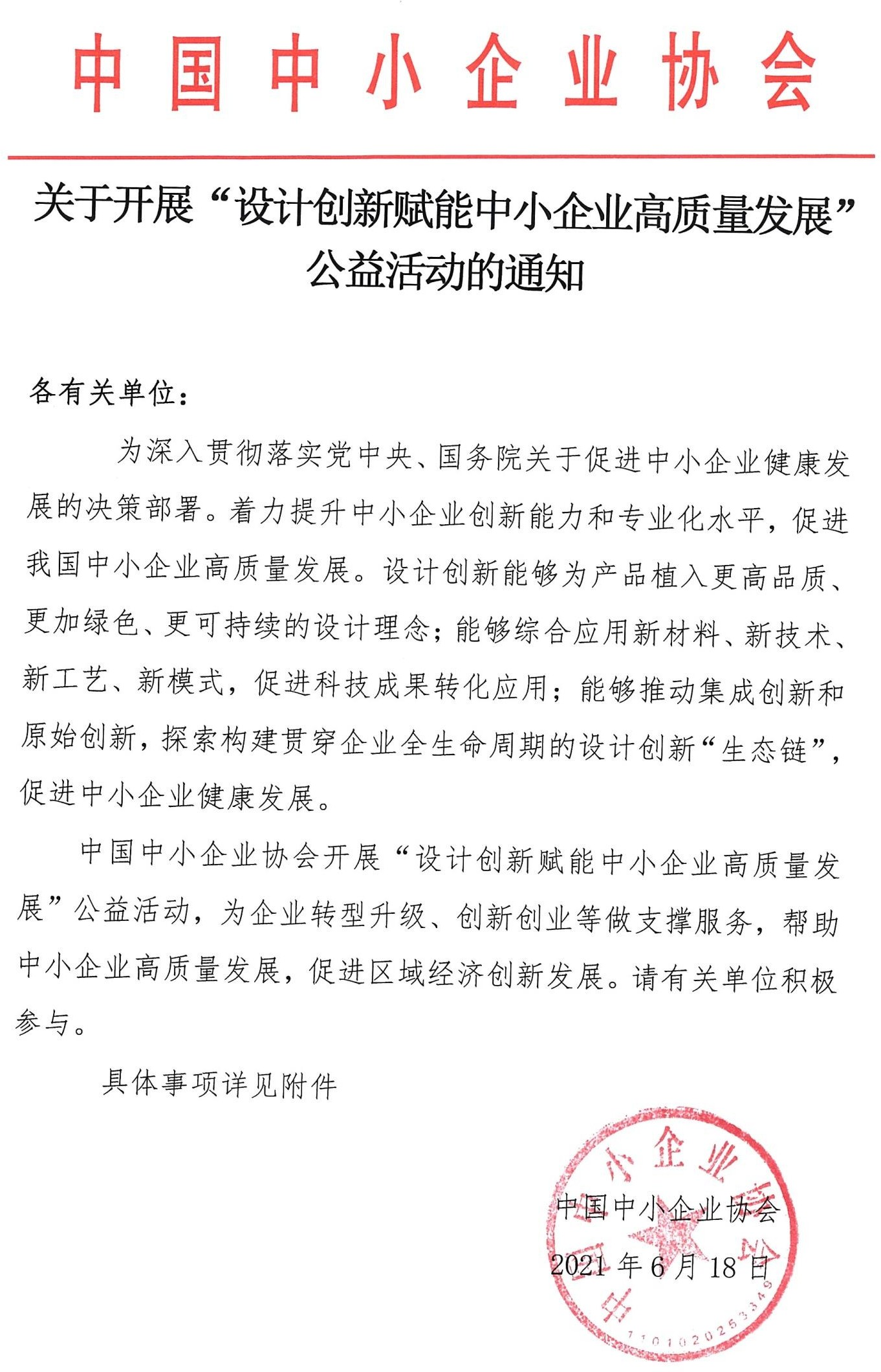 中国中小企业协会《关于开展“设计创新赋能中小企业高质量发展”公益活动的通知》