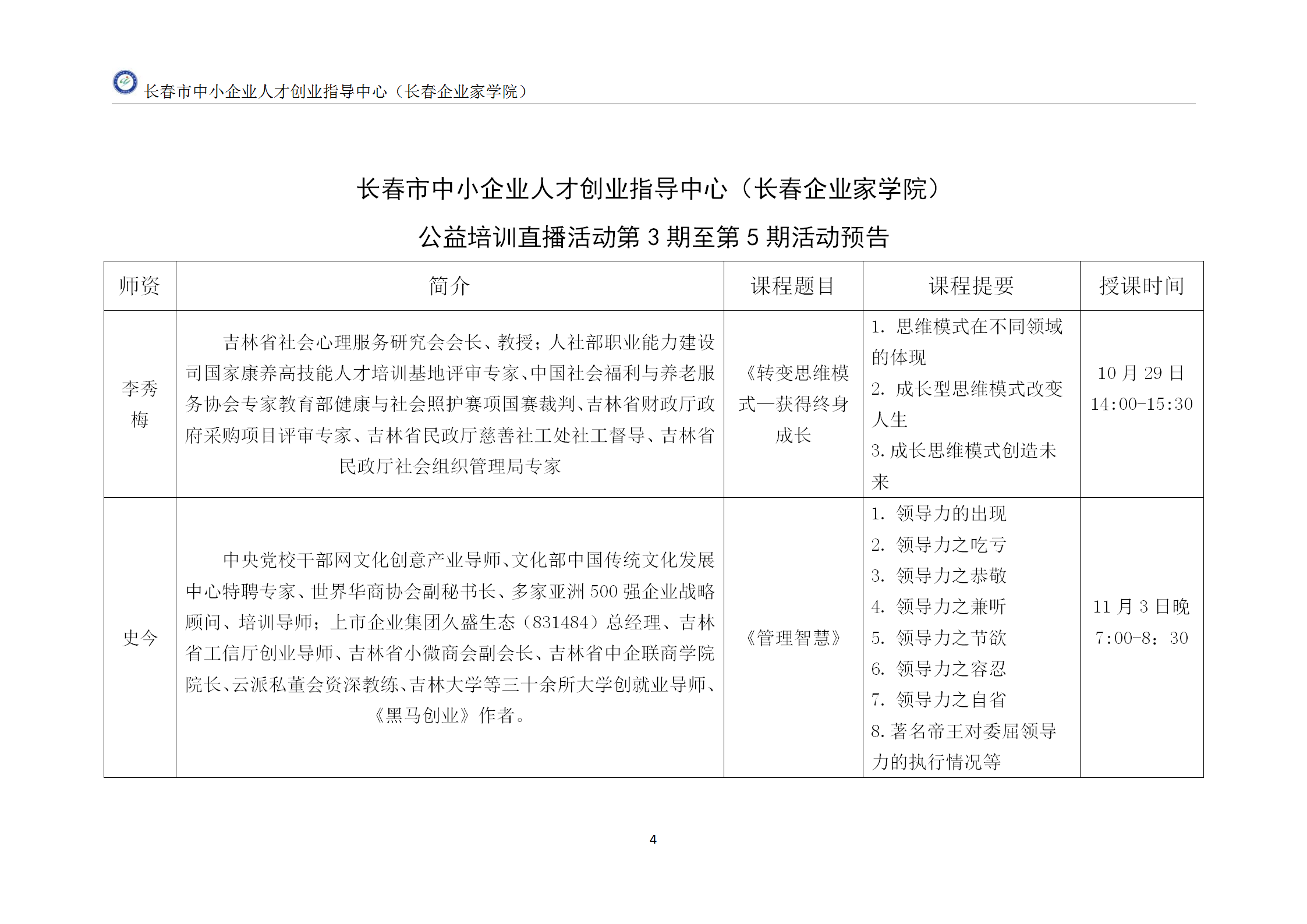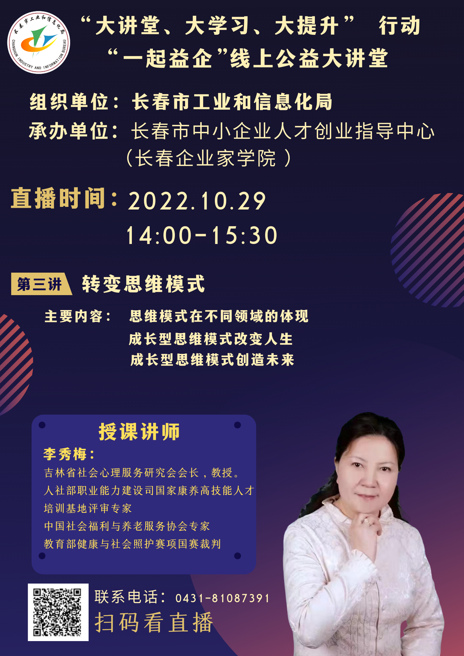 为进一步推进实施人才强市战略,强化人才培养体系建设,为企业发展提供强力的人才保障,推动我市中小企业(民营)经济健康发展。长春市中小企业人才创业指导中心(长春企业家学院)计划开展为期两个月的“一起益企”公益培训直播服务月活动,持续为我市中小企业的人才培育输出优质课程。现对第三场公益培训直播活动进行预告。
