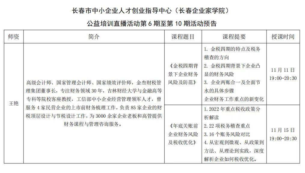 此次系列公益培训直播活动全部通过长春市中小企业人才创业指导中心(长春企业家学院)的官方微信视频号进行直播授课。课程内容涵盖“专精特新”中小企业专题、管理智慧专题、心理建设专题、自我发展专题等多个领域。请关注中心官方微信视频号,及时获取后续公益直播课程的信息,第6-10期公益培训直播预告详见附录1。