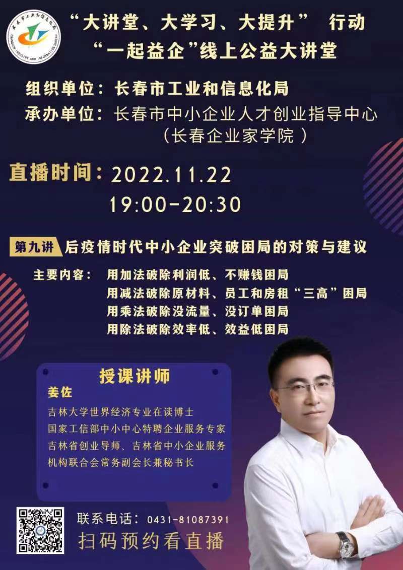 由长春市工业和信息化局主办,长春市中小企业人才创业指导中心(长春企业家学院)承办的“大讲堂、大学习、大提升”行动“一起益企”公益直播活动于10月20日首场开播以来,已开展公益培训直播活动8期次,参与人数达3644人,评论次数904次,分享次数462次,实现了对我市中小企业公益培训服务模式的积极探索。现对第九场公益培训直播活动进行预告。