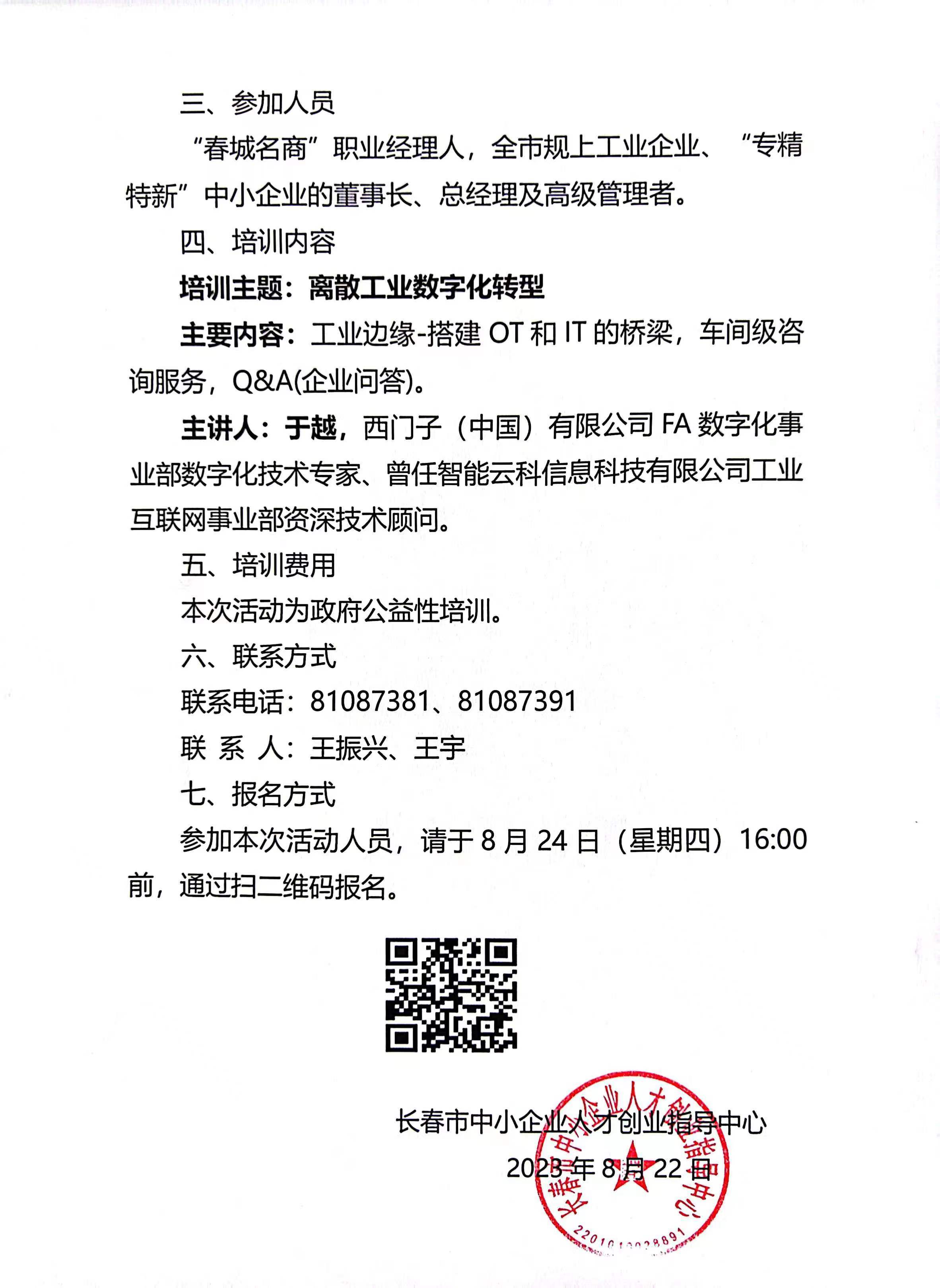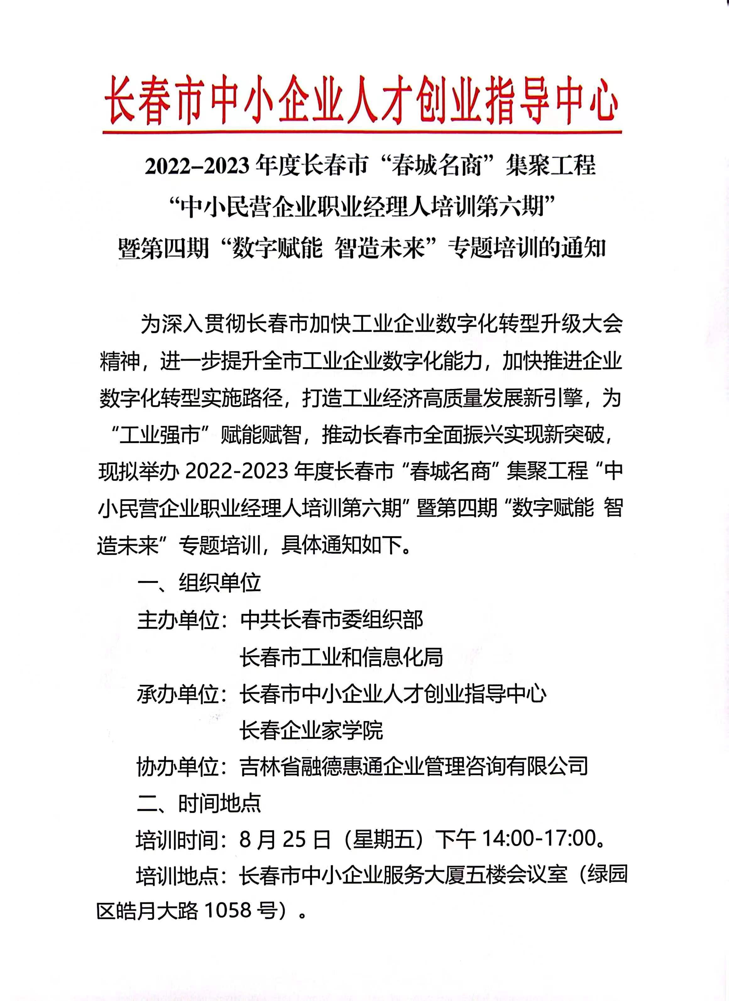 2022-2023年度长春市“春城名商”集聚工程“中小民营企业职业经理人培训第六期”暨第四期“数字赋能 智造未来”专题培训的通知