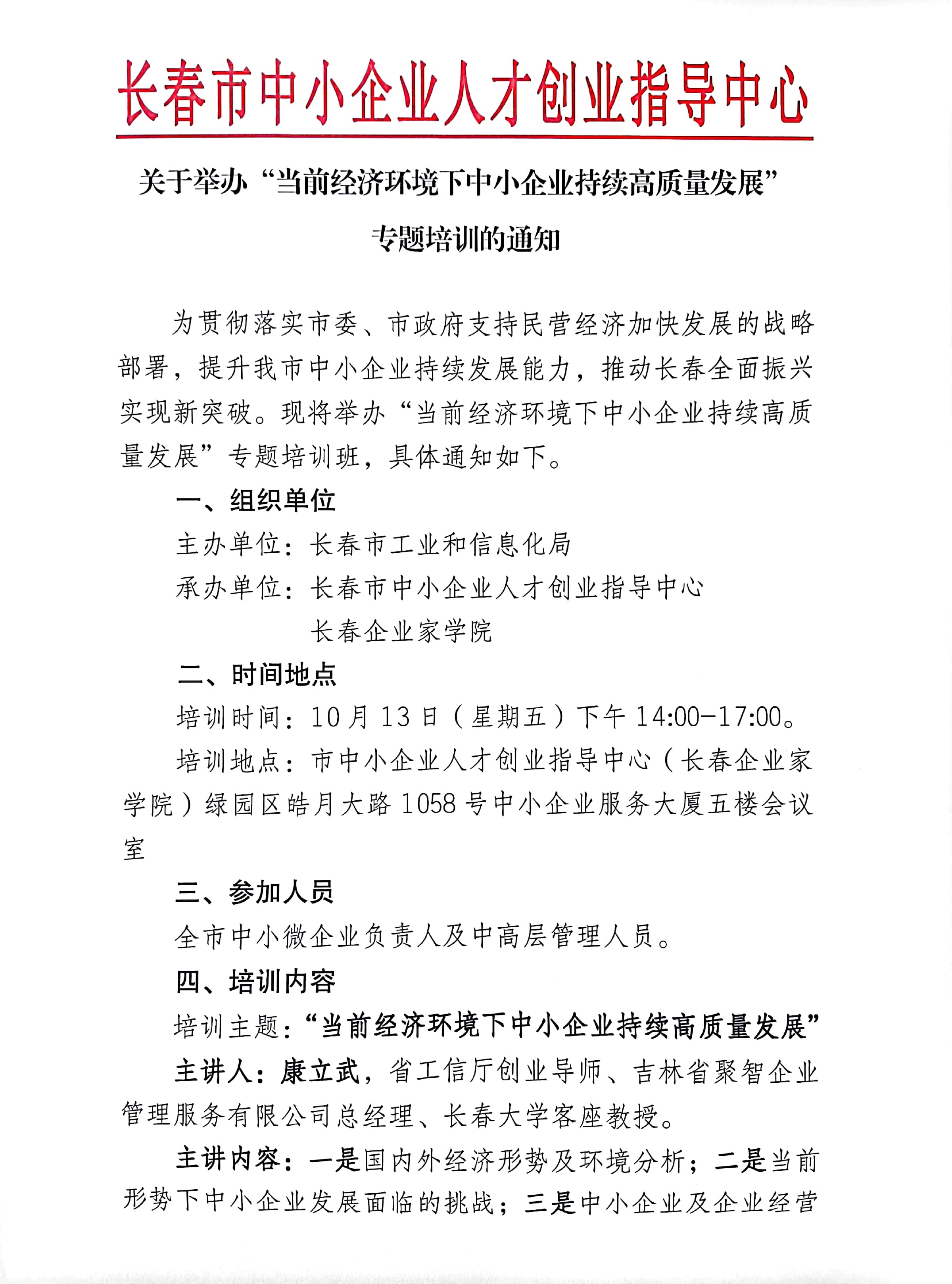 关于举办“当前经济环境下中小企业持续高质量发展”专题培训的通知