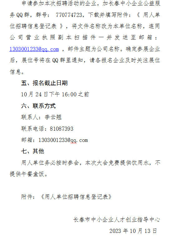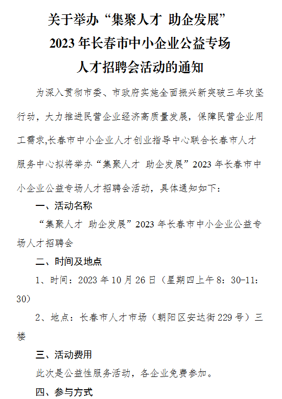 关于举办“集聚人才 助企发展”2023年长春市中小企业公益专场人才招聘会活动的通知