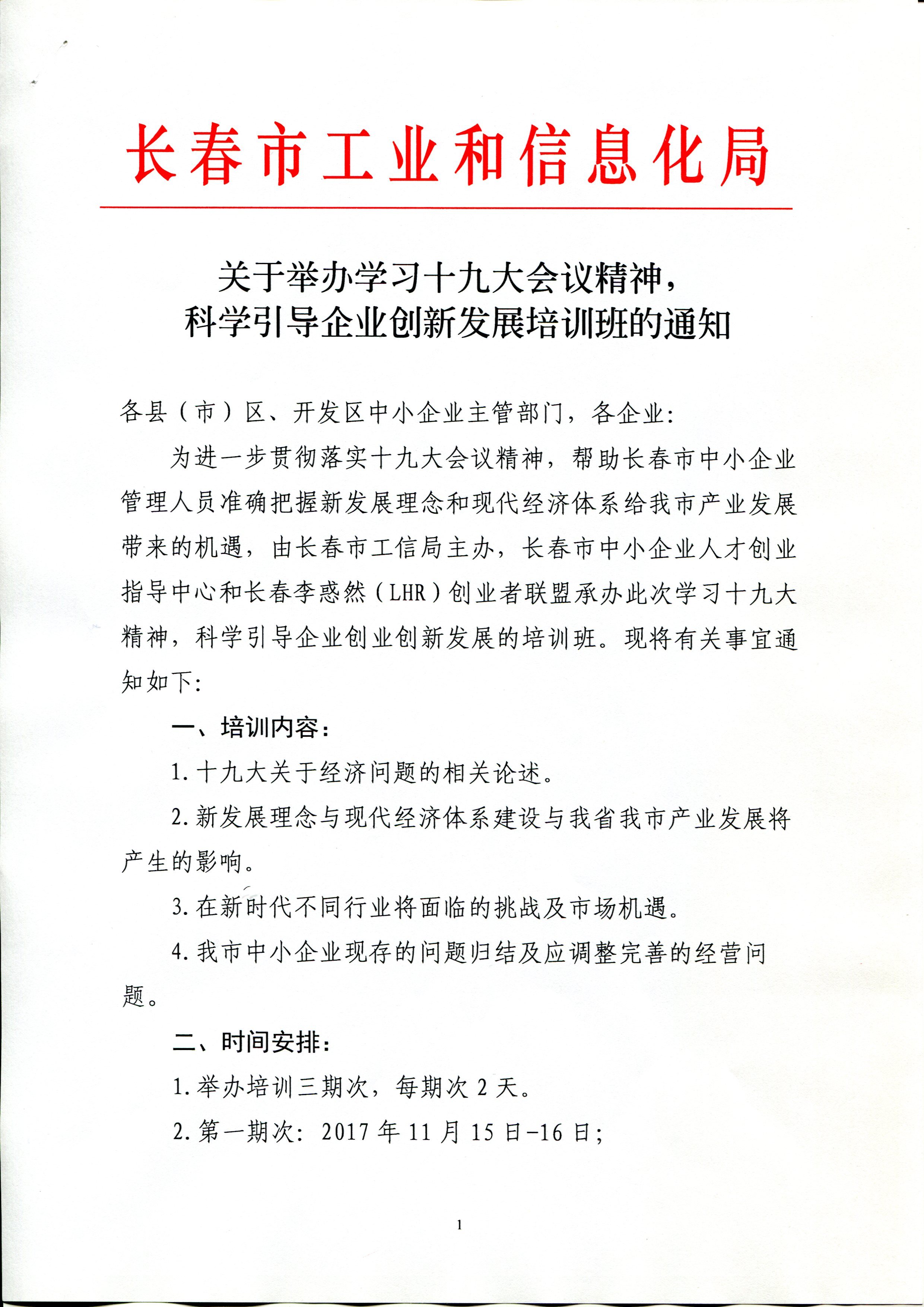 关于举办学习十九大会议精神,科学引导企业创新发展培训班的通知