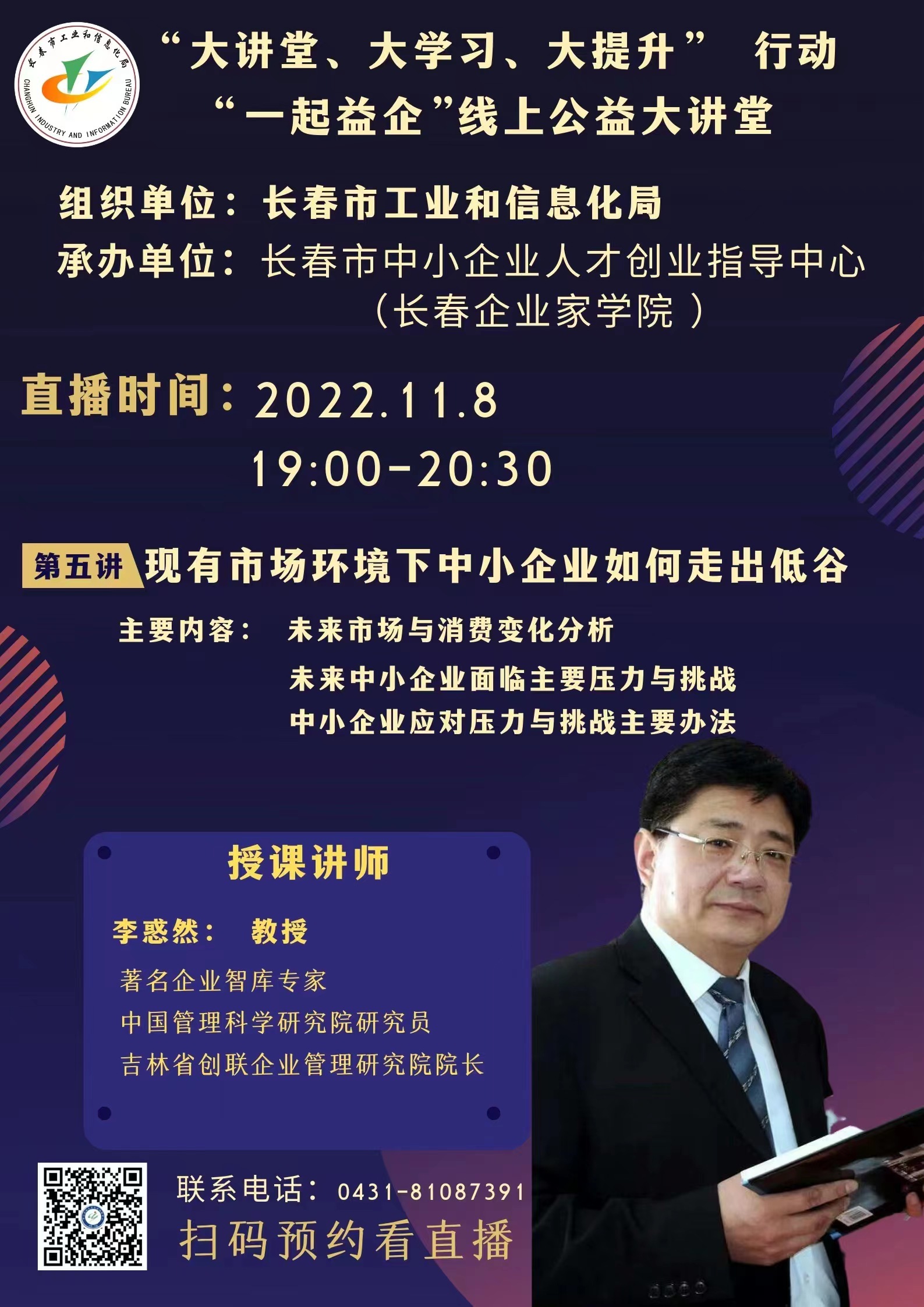 为进一步推进实施人才强市战略,强化人才培养体系建设,为企业发展提供强力的人才保障,推动我市中小企业(民营)经济健康发展。由长春市工业和信息化局组织,长春市中小企业人才创业指导中心(长春企业家学院)承办的“大讲堂、大学习、大提升”行动“一起益企”公益直播活动于10月20日首场开播。截至目前,已开展公益培训直播活动4期次,参与人数达1956人,评论次数434次,分享次数206次,实现了对我市中小企业公益培训服务模式的积极探索。现对第五场公益培训直播活动进行预告。
