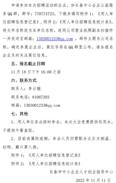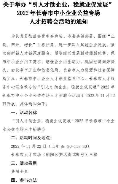 关于举办“引人才助企业,稳就业促发展”2022年长春市中小企业公益专场人才招聘会活动的通知
