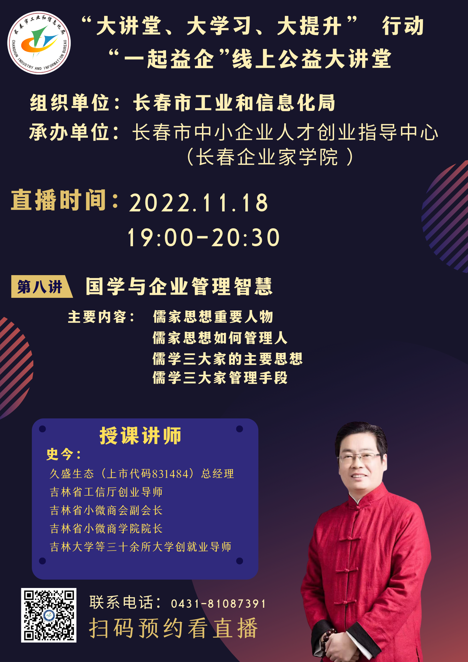 由长春市工业和信息化局主办,长春市中小企业人才创业指导中心(长春企业家学院)承办的“大讲堂、大学习、大提升”行动“一起益企”公益直播活动于10月20日首场开播以来,已开展公益培训直播活动7期次,参与人数达3472人,评论次数886次,分享次数418次,实现了对我市中小企业公益培训服务模式的积极探索。现对第八场公益培训直播活动进行预告。