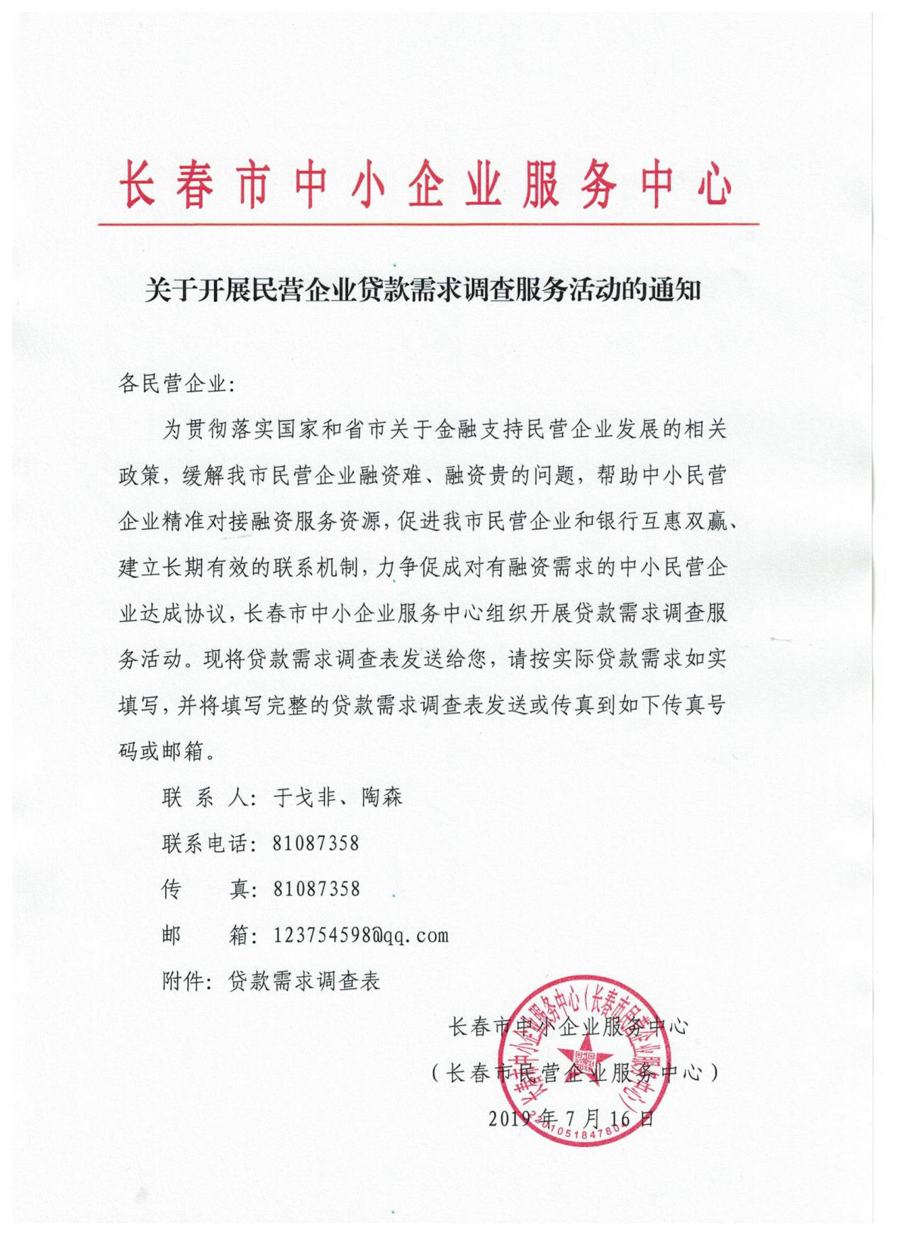 长春市中小企业服务中心关于开展民营企业贷款需求调查服务活动的通知