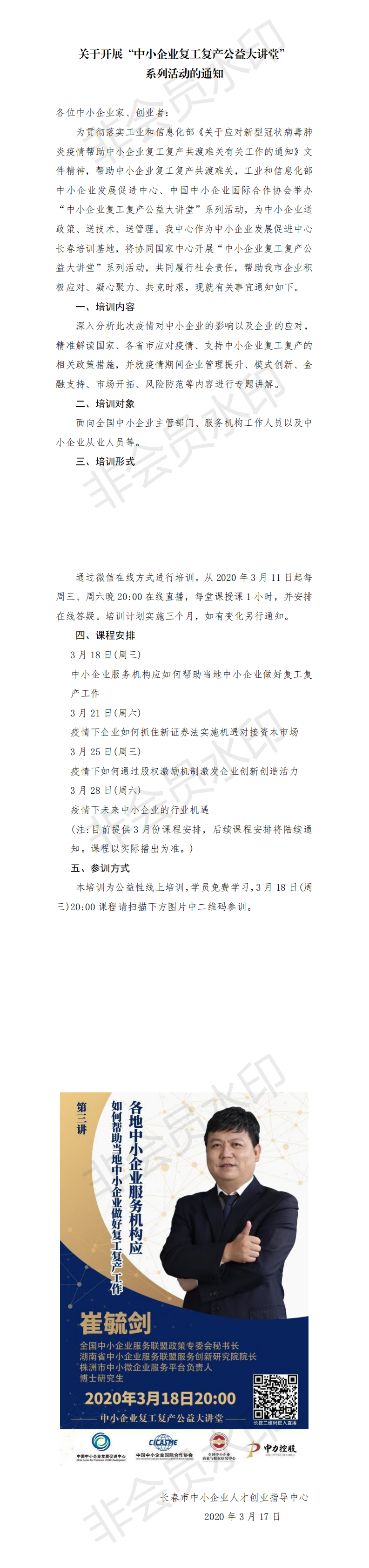 关于开展“中小企业复工复产公益大讲堂”系列活动的通知