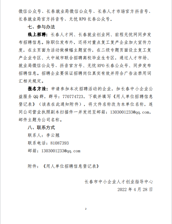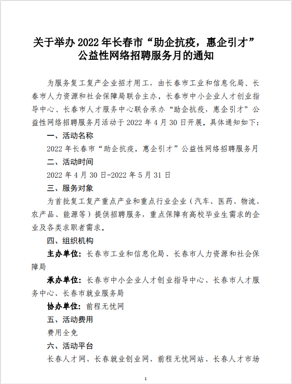 关于举办2022年长春市“助企抗疫,惠企引才”公益性网络招聘服务月的通知