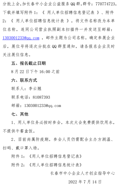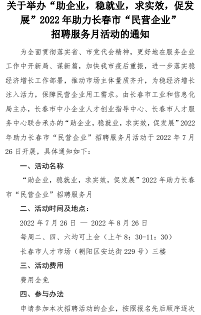 关于举办“助企业,稳就业,求实效,促发展”2022年助力长春市“民营企业”招聘服务月活动的通知