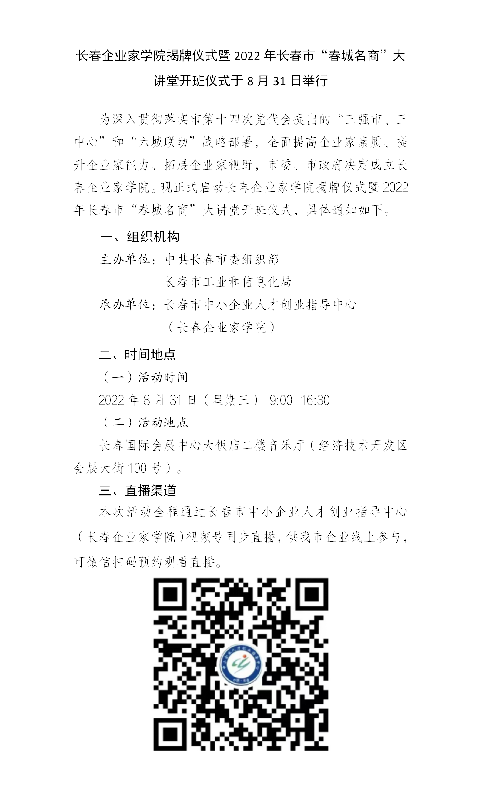 长春企业家学院揭牌仪式暨2022年长春市“春城名商”大讲堂开班仪式于8月31日举行!