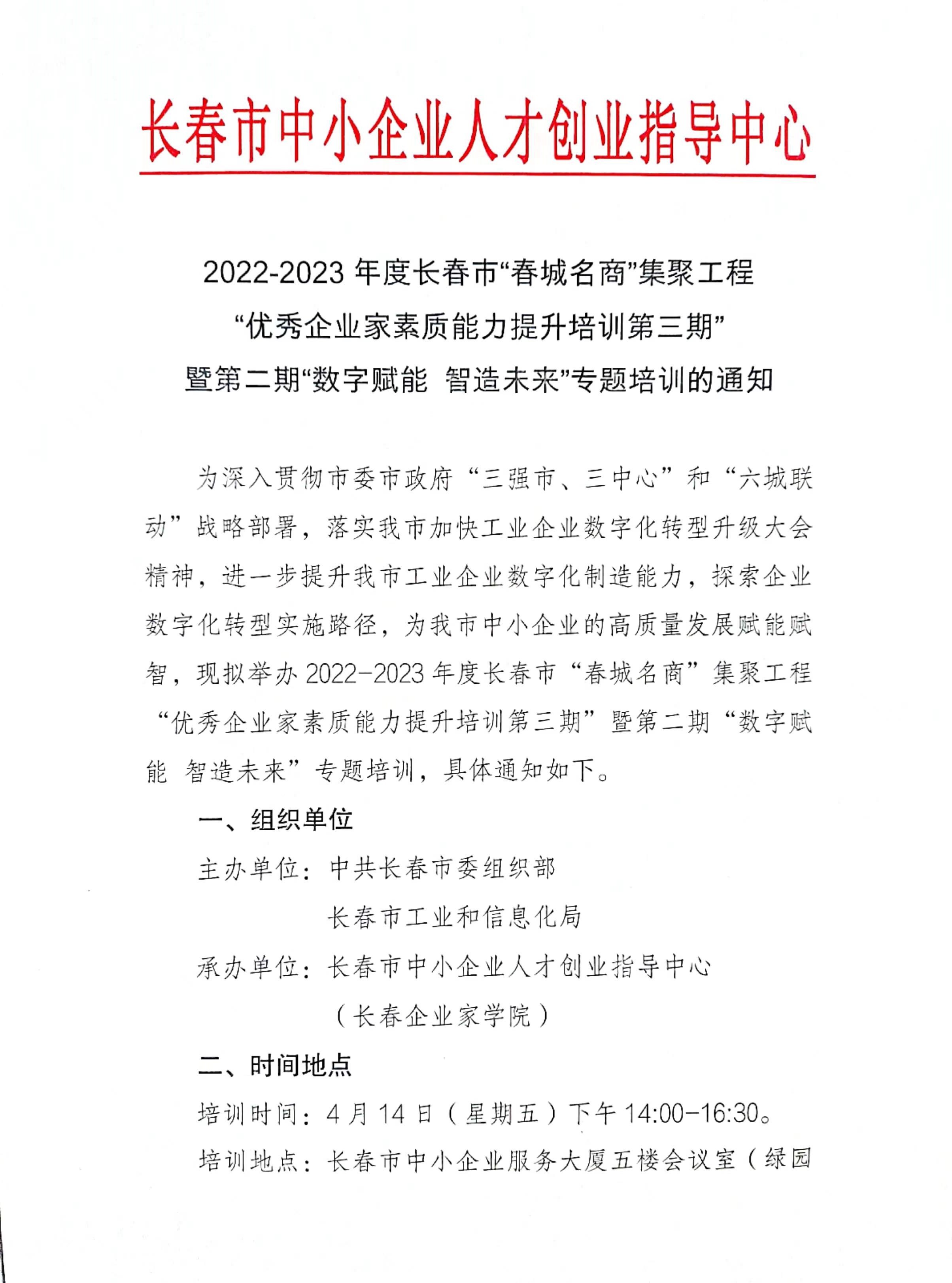 2022-2023年度长春市“春城名商”集聚工程“优秀企业家素质能力提升培训第三期”暨第二期“数字赋能智造未来”专题培训的通知