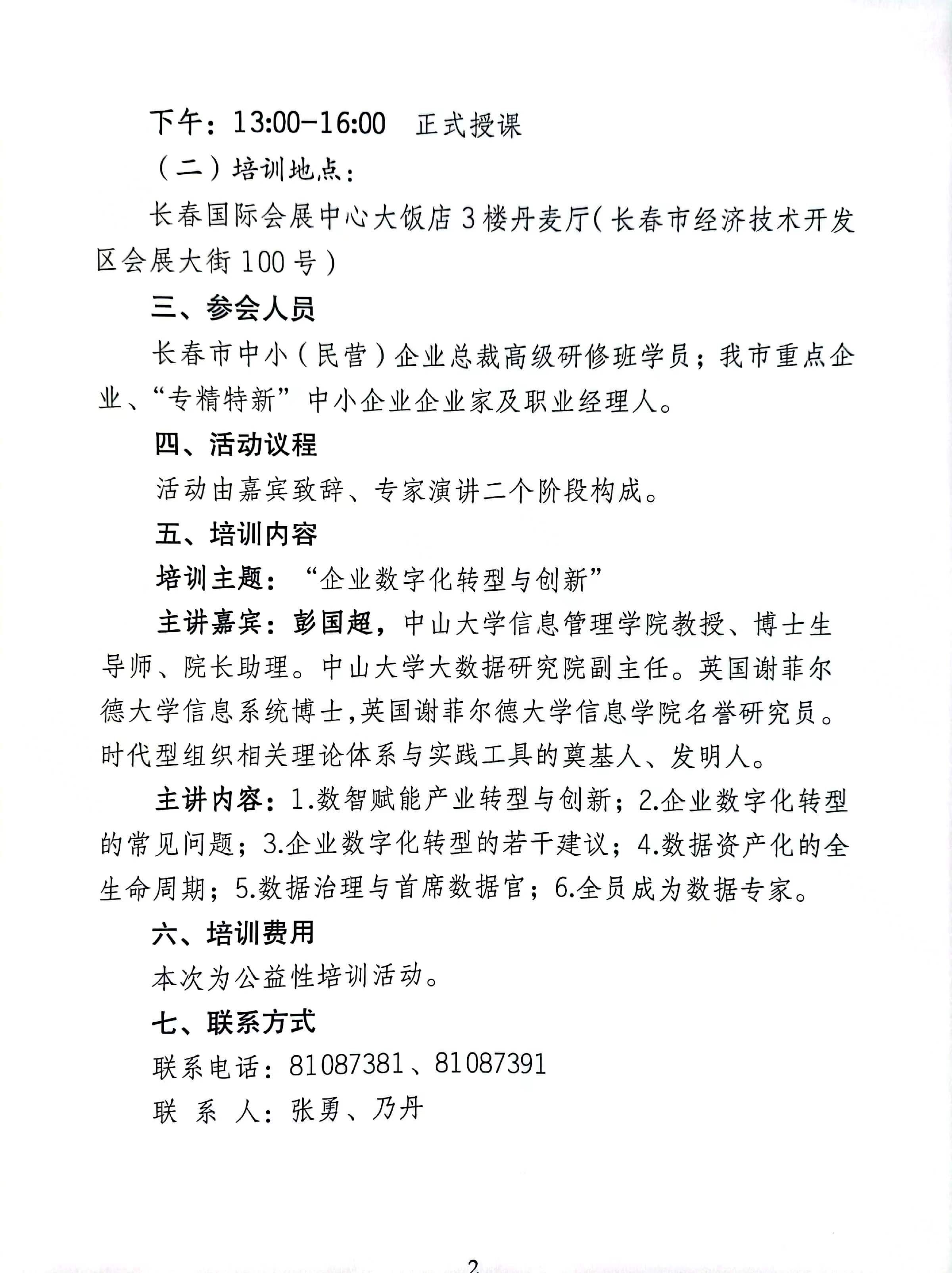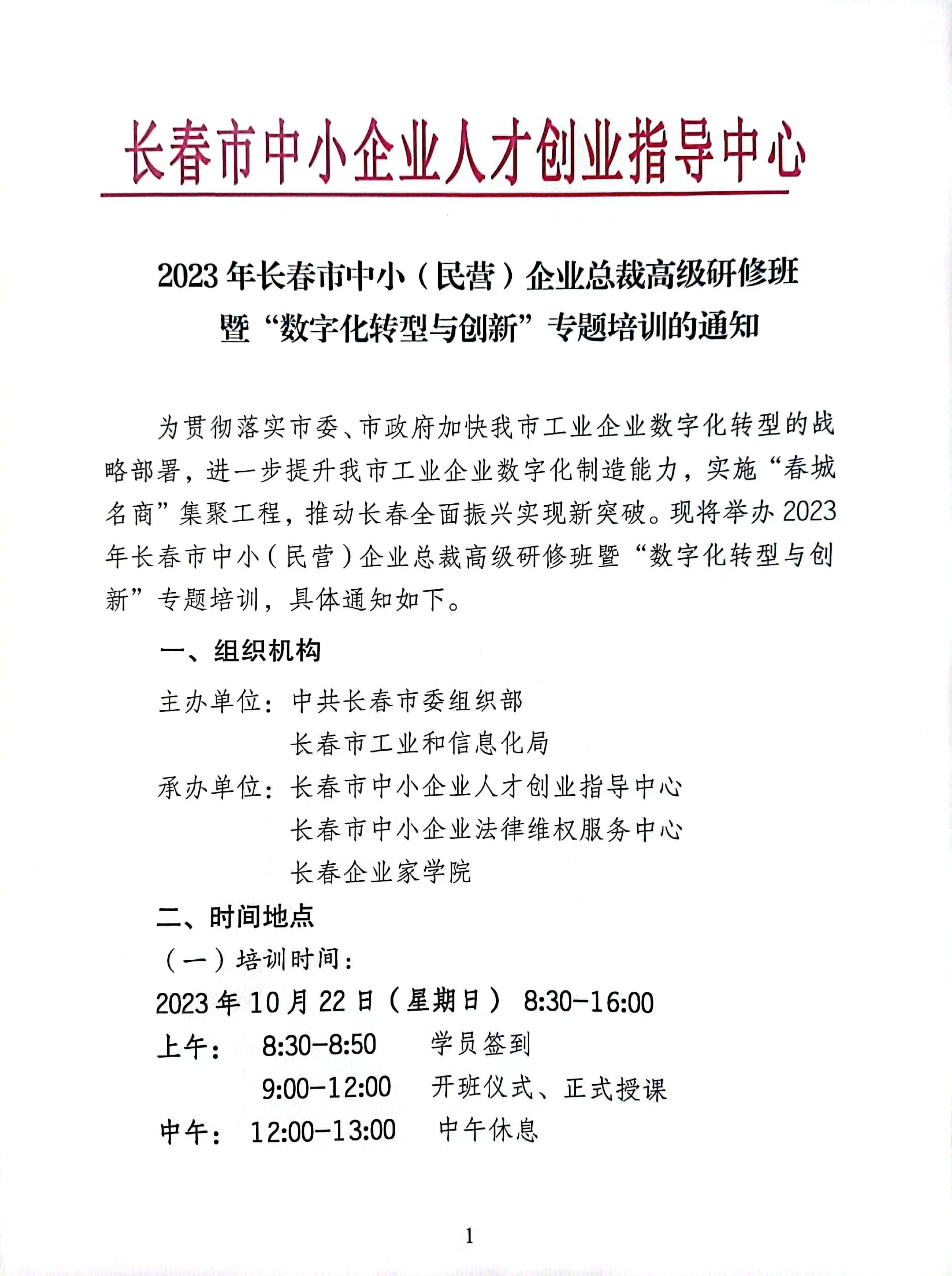 2023年长春市中小(民营)企业总裁高级研修班暨“数字化转型与创新”专题培训的通知