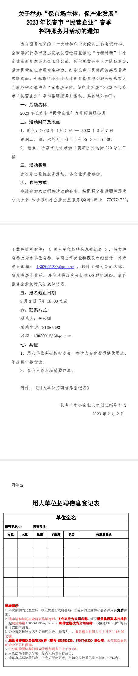 关于举办“保市场主体,促产业发展”2023年长春市“民营企业”春季招聘服务月活动的通知